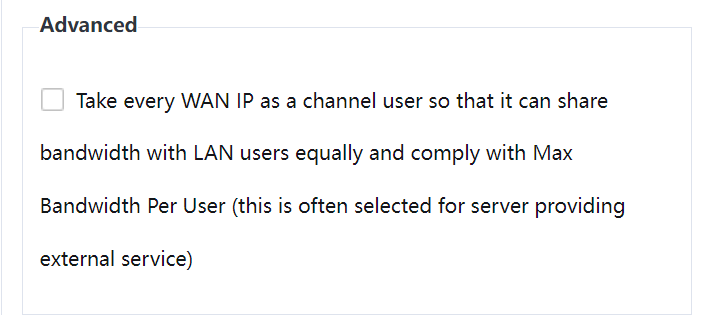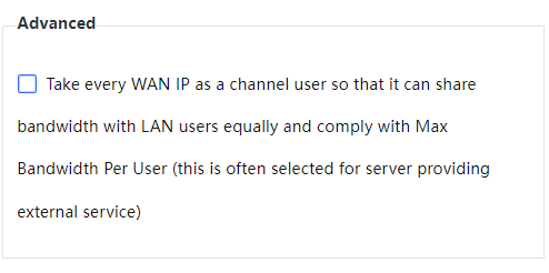 Advanced: If this option is selected, each external network IP address can be regarded as a user in the channel so that bandwidth can be fairly allocated among the users in the channel, and the maximum bandwidth attribute set for each user applies to the external network IP addresses. (This is generally used by servers providing services externally. Use it with caution.)