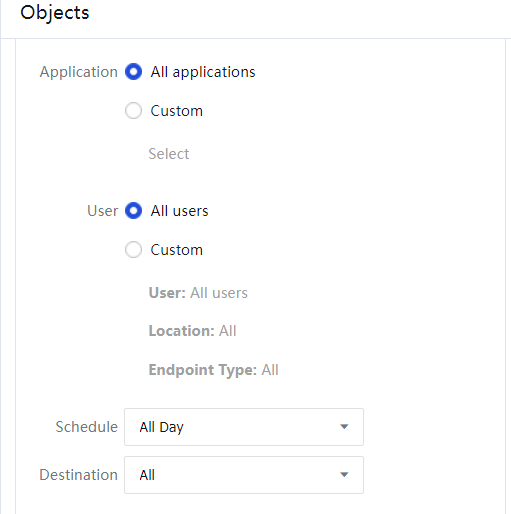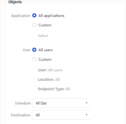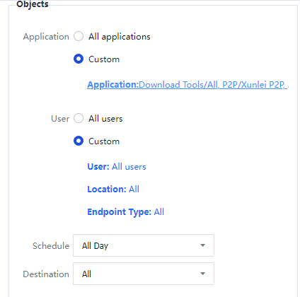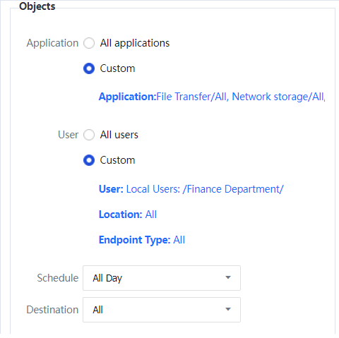 Object: It specifies the data types to which the channel is available. The channel is available only when the criteria, including applicable application, applicable object, effective time, and destination IP address group, are met.