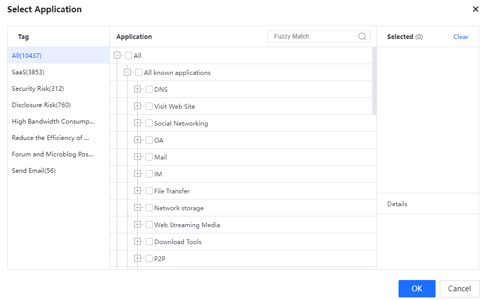 Application: To specify the application types to which the channel is available. All Applications indicates all types of applications. Specified allows you to select application types. You can click Select and select application types and website types in the User-Defined Applicable Service and Application dialog box that appears. In this example, select Mail/All, Website Access/Online Payment, and Website Access/Personal Banking to ensure access to online banking websites and send and receive emails.