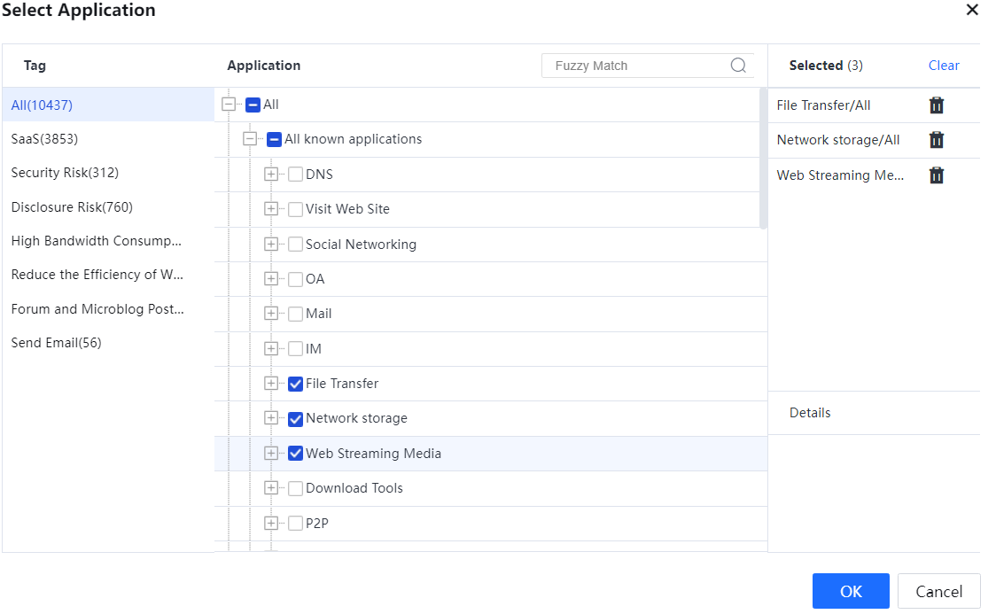 Objects: To specify the application types to which the channel is available. All Applications indicates all types of applications. Specified allows you to select application types. You can click Select and select application types in the User-Defined Applicable Service and Application dialog box that appears. In this example, select Download Tools, P2P, and P2P Stream Media to implement traffic control for P2P data download tools. Make sure that the Selected list is correct and click OK.