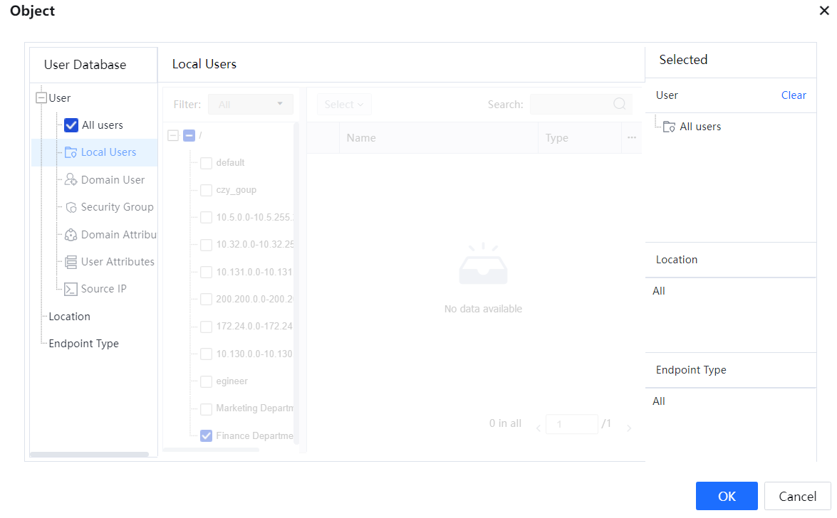 Applicable Object: It specifies the users, locations, and endpoint types to which the channel is available. All Users indicate all intranet users. Specified indicates specified users and user groups. You can click Objects and select objects in the User-Defined Applicable Object dialog box that appears. In this example, bandwidth limitation must be implemented for all users in the marketing department. Therefore, select the Marketing Department user group and click OK.