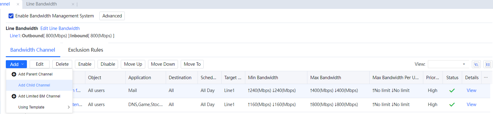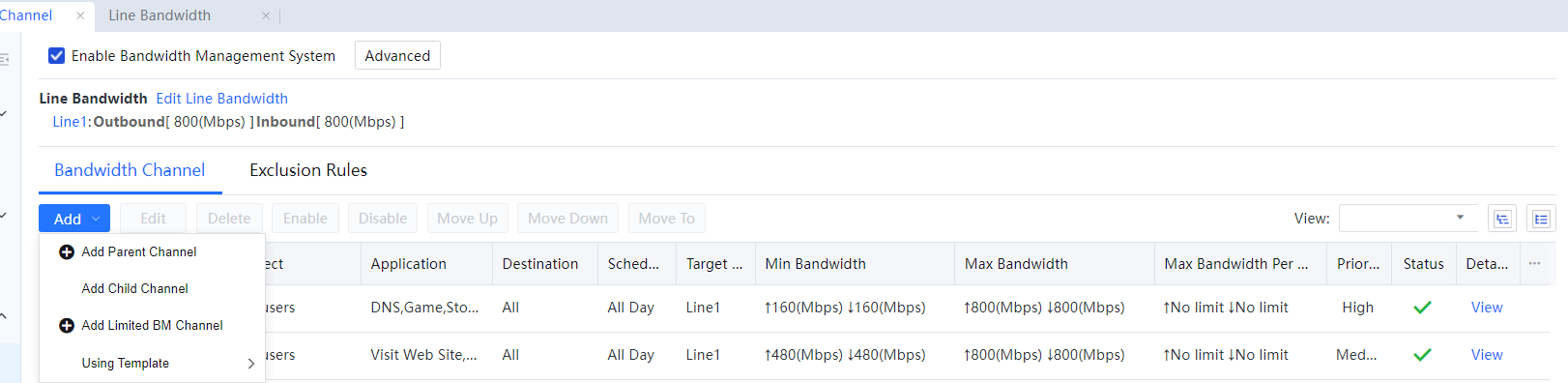 Bandwidth Channel Settings: Set the effective line, channel type, limited or assured bandwidth, and per-user bandwidth.