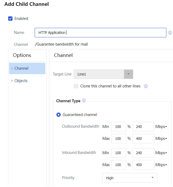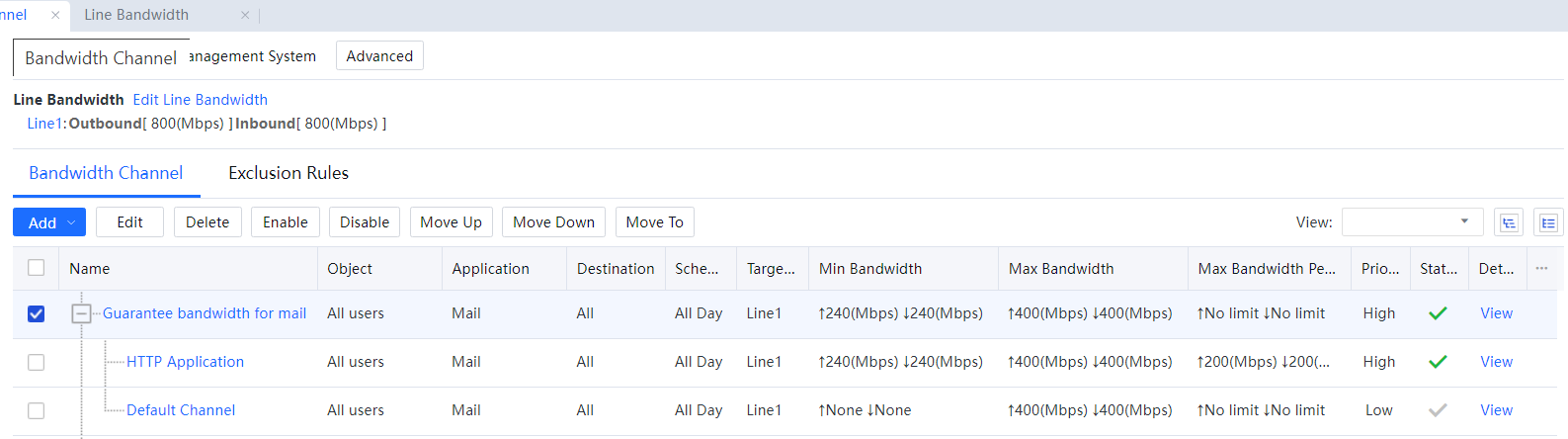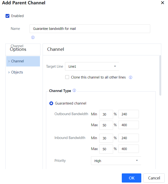Bandwidth Channel Type: To select a channel type and set bandwidth thresholds. In this example, all intranet users must be allocated 240 to 400 Mbps bandwidth to send and receive emails. Therefore, select Guaranteed Channel and set Minimum and Maximum bandwidth of Outbound Bandwidth and Inbound Bandwidth to 30% and 50% of the total bandwidth. The total bandwidth is 800 Mbps; therefore, the assured bandwidth is 240 Mbps, while the maximum bandwidth is 400 Mbps. Priority includes three options, High, Medium, and Low, which indicate the priority of allocating bandwidth of other channels to this channel when the other channels are idle.