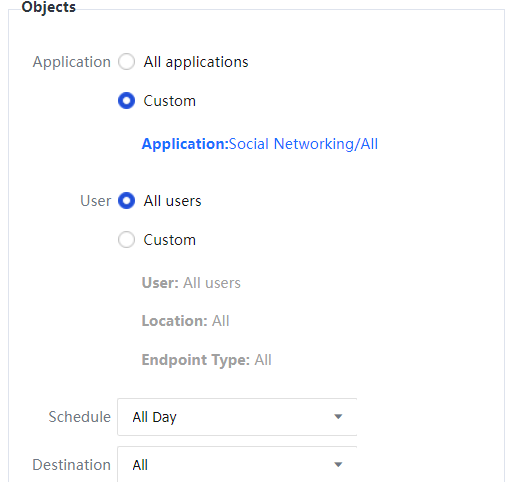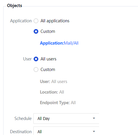 Set Applicable Object to All Users, Scheduled to All day, and Destination to All. After the parameters are set, the settings are displayed. See the following figure.