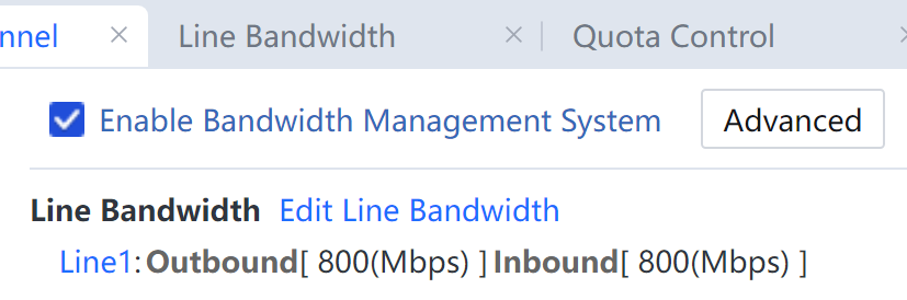 Step 1.Choose Bandwidth Management > Line Bandwidth and configure Internet line bandwidth. Click Line 1. The Edit Line Bandwidth window is displayed. In this example, the company leases an 800 Mbps line; therefore, the values of Outbound and Inbound are set to 800 Mbps.