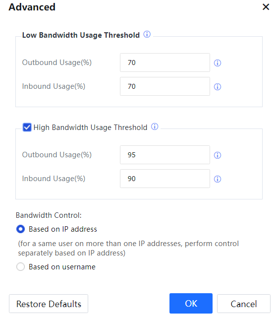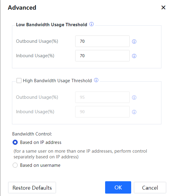 Click Advanced, set the Low Bandwidth Usage Threshold, and specify whether to enable a high bandwidth usage threshold. See the following figure.