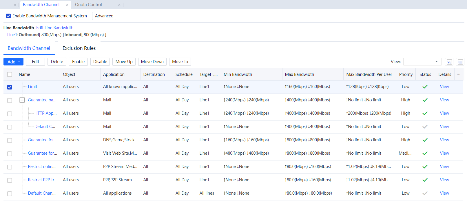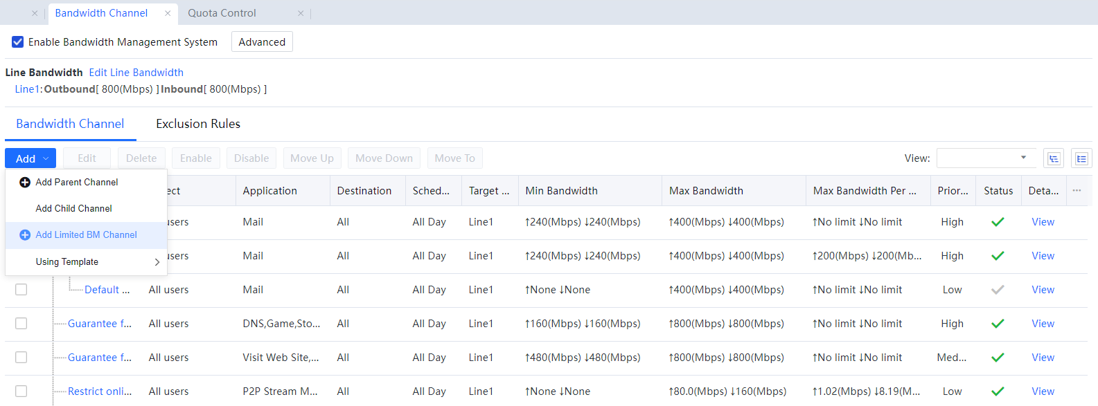 Bandwidth Channel Type: Select a channel type and set bandwidth thresholds. In this example, marketing personnel's bandwidth for data transfer is limited. Select Limited Channel and set Outbound Bandwidth and Inbound Bandwidth to 20% of the total bandwidth each. The total bandwidth is 800 Mbps; therefore, the limited bandwidth is 4 Mbps. Priority includes three options, High, Medium, and Low, which indicate the priority of bandwidth allocation to the channel during peak traffic hours.