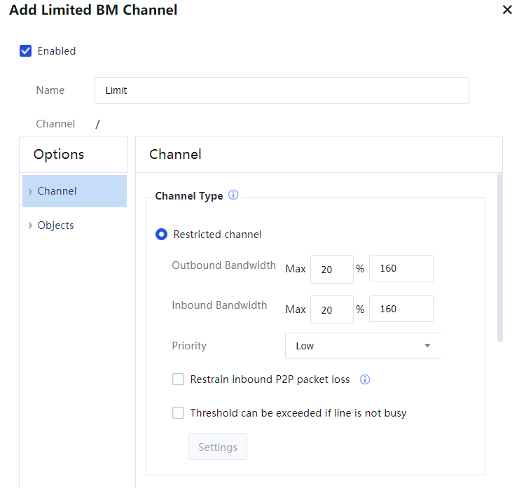 On the Bandwidth Management tab page, click Add and choose Add Limited BM Channel. The Add Limited BM Channel page is displayed.
