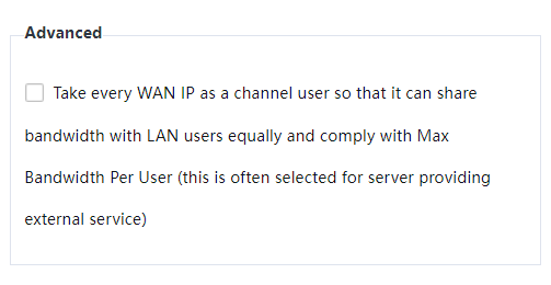 Advanced: If this option is selected, each external network IP address can be regarded as a user in the channel so that bandwidth can be fairly allocated among the users in the channel. Each user's maximum bandwidth attribute set applies to the external network IP addresses. (This option is generally used by servers providing services externally. Use it with caution.)