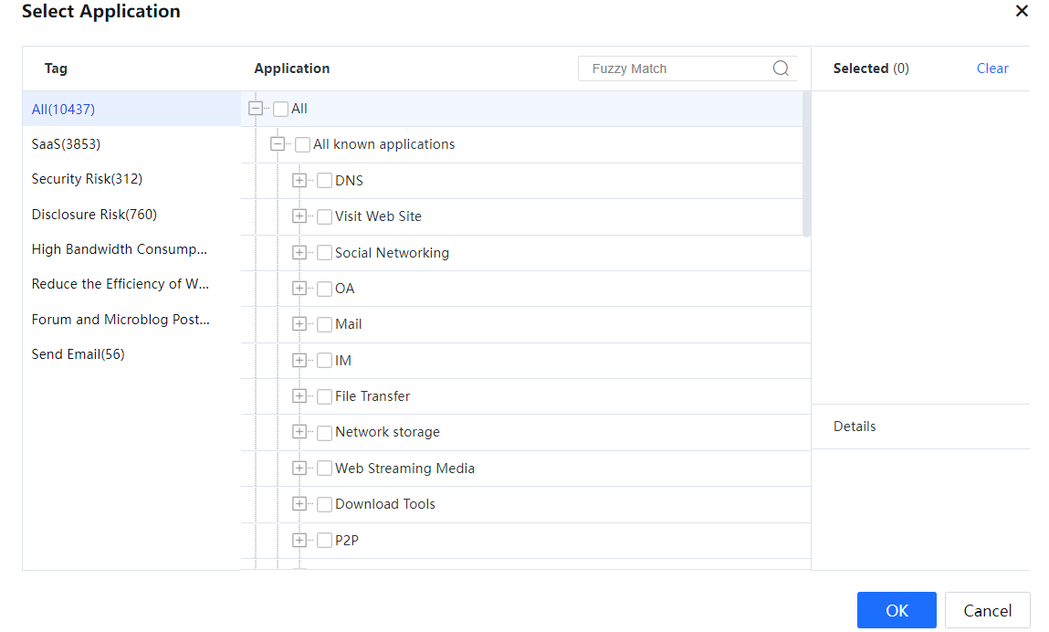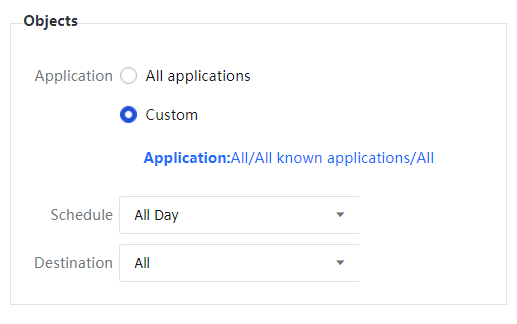 Objects: Specify the application types to which the channel is available. Applications indicate all types of applications. Specified allows you to select application types. You can click Select and select application types in the User-Defined Applicable Service and Application dialog box that appears. In this example, select All to implement traffic control over all data. Make sure that the Selected list is correct and click OK.