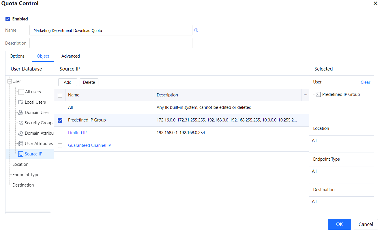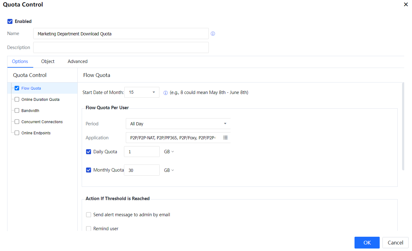 In this example, the daily download traffic of each user in the marketing department cannot exceed 1 GB, and the monthly download traffic cannot exceed 30 GB.