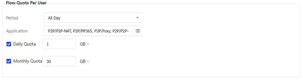 Quota Policy: Select the user limitation type and set related parameters. In this example, the traffic quota for P2P download tools such as XunLei must be limited for the marketing department. Select Flow Quota and set the parameters.