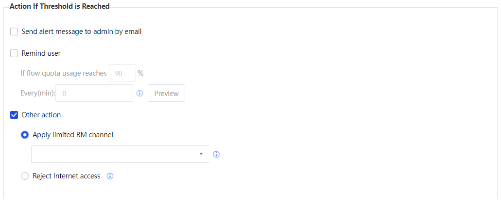 Quota Policy provides five quota control, including Flow Quota, Online Duration Quota, Bandwidth, Concurrent Connections, and Online Endpoints. This section describes the method to configure a limited BM channel and only one type of user quota policy.