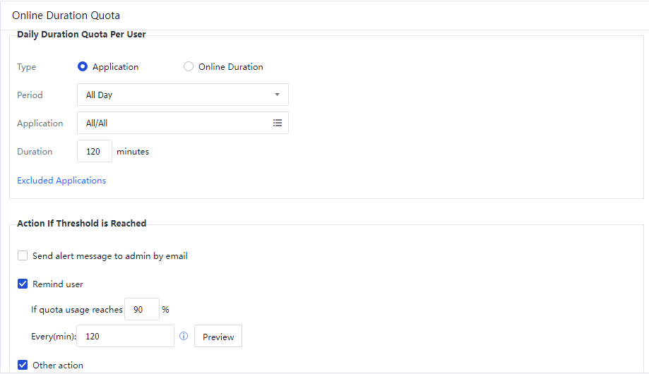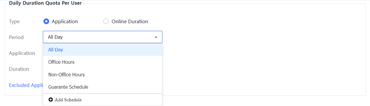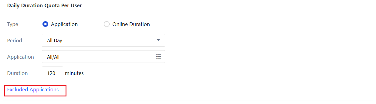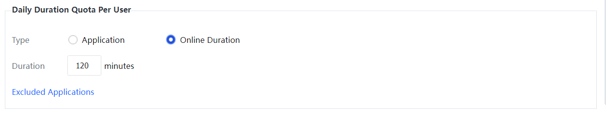 Check Online Duration in the Daily Duration Quota Per User column on the duration quota interface. In the Type column, you can define the daily online duration of a single user according to your needs. At the same time, you can also set excluded applications, and users will not be counted in the duration when using the applications added to the excluded column.