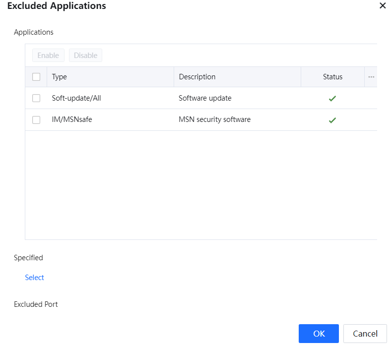 Step 4.On the pop-up Excluded Application page, click Select under the Specified column, and select the application to be excluded in the pop-up interface or fill in the corresponding application port in Excluded Port.