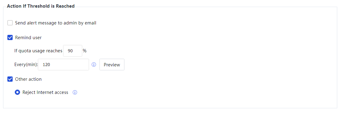 The following three punishment measures can be configured for users who exceed the time limit in the Action If Threshold is Reached column.