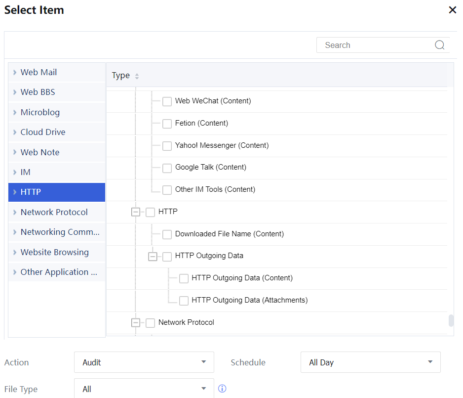 Step 2.The Select Item window includes the HTTP Data Outgoing, Website Browsing/Downloads, Email, IM, FTP, Telnet, and Application menu items. You can click the menu items to go to the corresponding configuration modules.