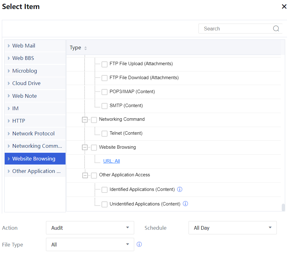 Website Browsing/Downloads: To record the URLs of webpages accessed by intranet users and the names of files downloaded from websites. You can select All to audit all URLs. You can also select Specified to specify URL types so that only access to the URLs of the specified types is recorded. When you click Specified, the Select page is displayed. On the page, you can select the URL group to be audited. (For details of setting URL groups, see Section 3.5.4.) If you select File name of downloaded file, the names of files downloaded from websites using the HTTP protocol are audited, and file content is not recorded.