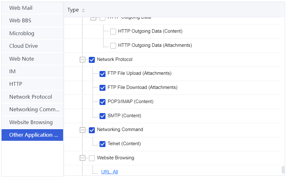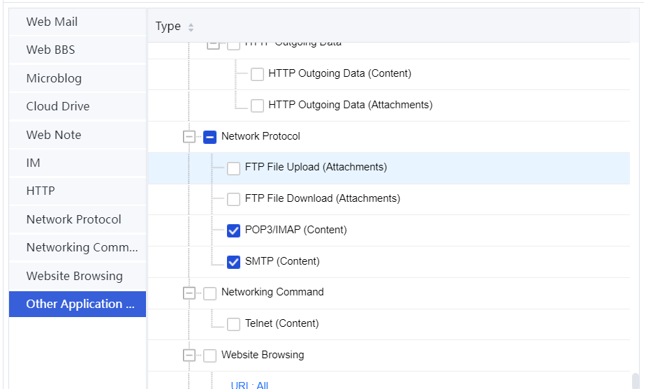 Email: To audit intranet users' attempts to send and receive mails using the mail client. You can select Outgoing email (SMTP) to audit the information about emails, including email attachments sent by intranet users. You can select Incoming email (POP3/IMAP) to audit the information about emails, including email attachments, received by intranet users.