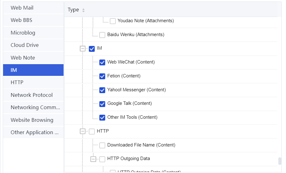 IM: It audits instant messaging between intranet users with IM tools. The tool options include MSN, Yahoo, Google-Talk, Fetion, WebQQ, and Web-MSN. Other IM chats: It specifies whether to audit IM content when an IM type is added to the audit rule library.