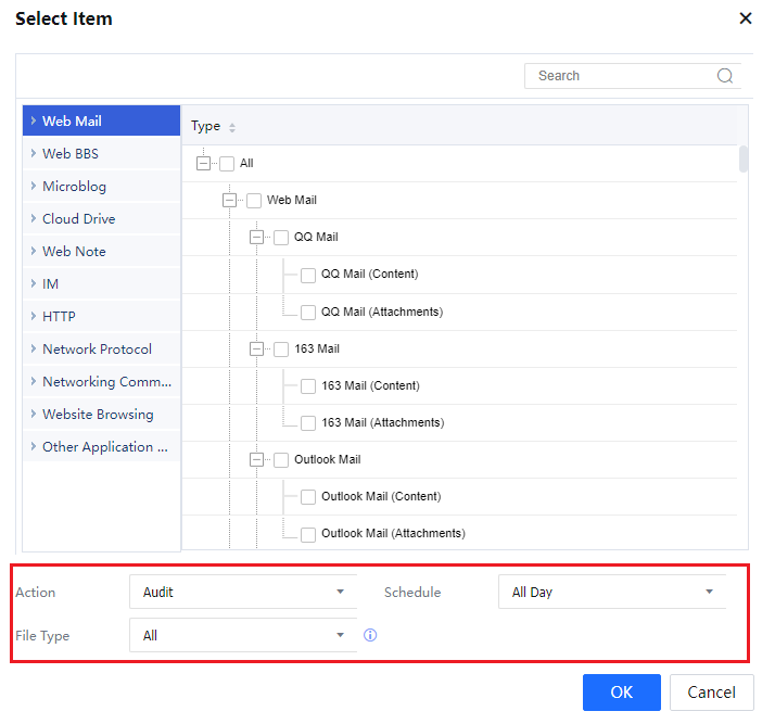 You can select Web Mail contents to audit the bodies (excluding attachments) of emails sent by intranet users through webpages. You can also select Web-based attachment upload (including WebMail) to audit the attachments uploaded through webpages. This option is required for auditing webmail attachments. You can select Web-based text upload to record all the text uploaded over HTTP.