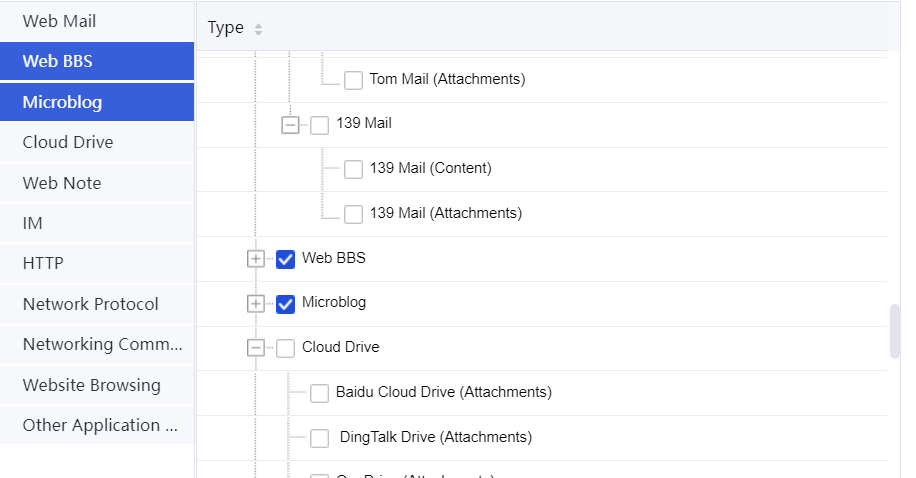 Therefore, you are recommended to select Web-based BBS posting and Web Mail contents instead. You can select Microblogging contents to record intranet users’ behavior of posting microblogs through the Microblog desktop client and web browser. The microblog subjects and content are not recorded. To audit the file names of image and video attachments posted on microblogs, select Include microblog attachment (such as image, video and music).