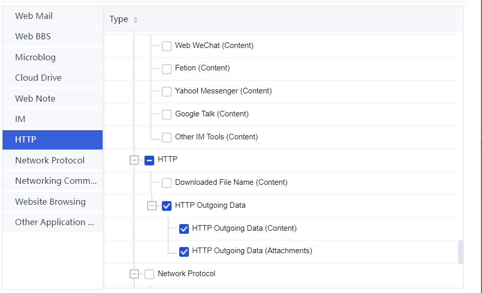 HTTP Data Outgoing: You can select Web-based BBS posting to record intranet users’ behavior of visiting and posting on web BBSs. The log records the posting information except for the post subjects and content. You can select Web Mail contents to record intranet users’ behavior of sending mails through webpages. The log records the mail information except for the mail subjects and content. You can select Web-based attachment upload (including WebMail) to audit file names of attachments uploaded over webpages. To audit attachments of webmails, select this check box. You can select Web-based text upload to record behaviors of uploading text over HTTP. If this check box is selected, there will be a large number of logs.