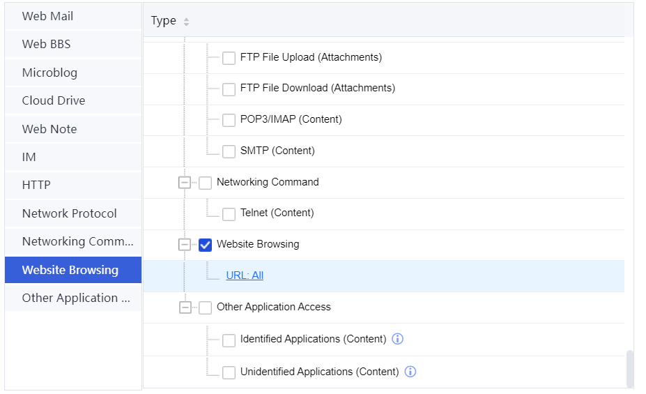 Email: It audits intranet users' attempts to send and receive emails using the mail client. You can select Outgoing email (SMTP) to audit intranet users' attempts to send emails. In this case, mail information excluding subjects and bodies is logged. You can select Incoming email (POP3/IMAP) to record intranet users' attempts to receive emails. In this case, email information excluding subjects and bodies is logged.