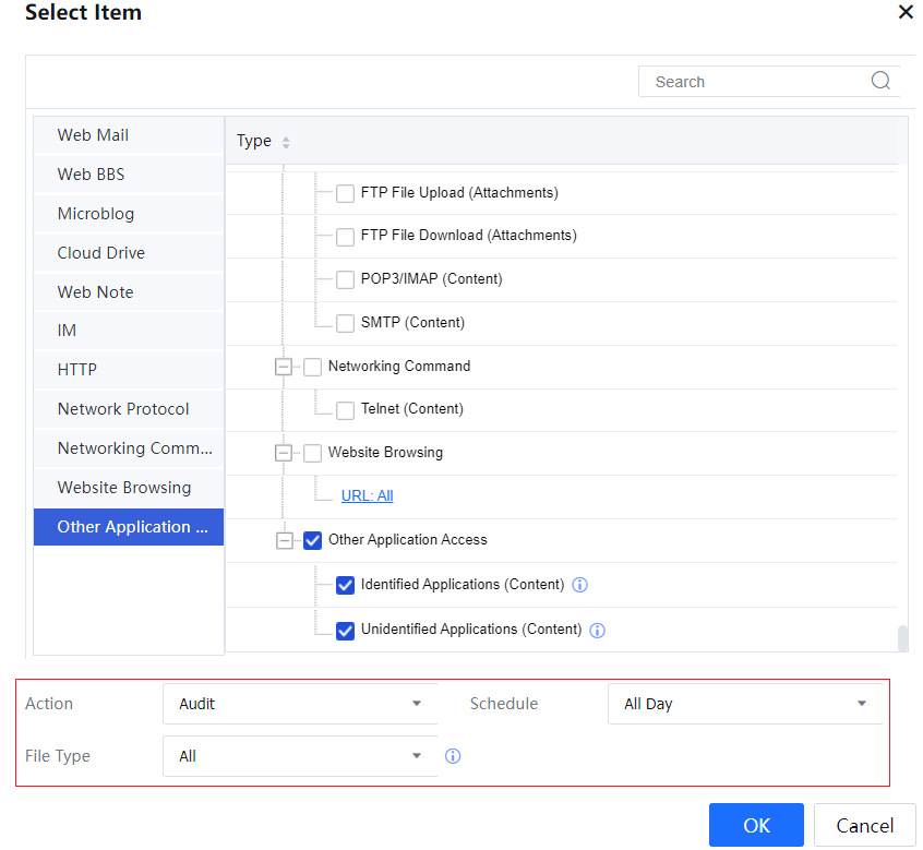 Step 5.Click OK. The policy for auditing web-based BBS posting, microblogging content, webmail content, web-based attachment upload, users’ visited URL, the file name of download file, and various types of identified Internet access behaviors is configured.