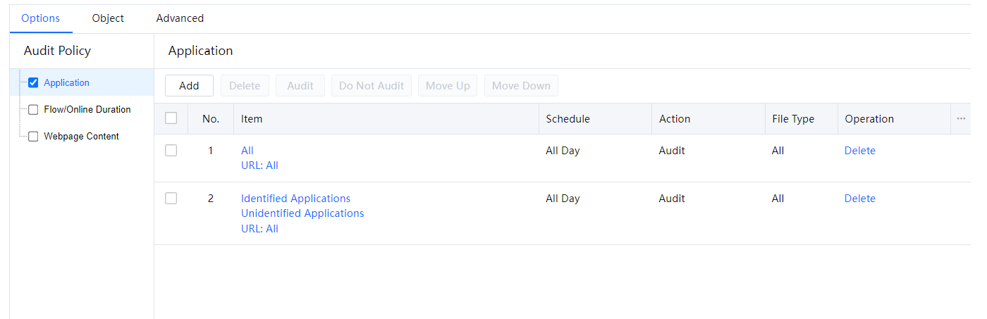 Step 4.Step 3 After selecting audit options, click OK. The Application page is displayed. Set Schedule to All Day and Action to Audit.
