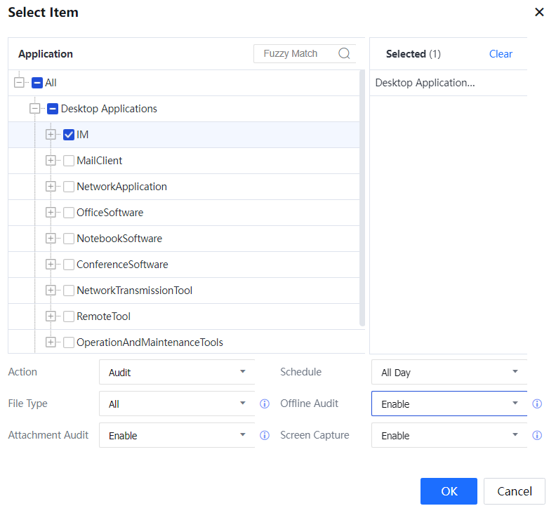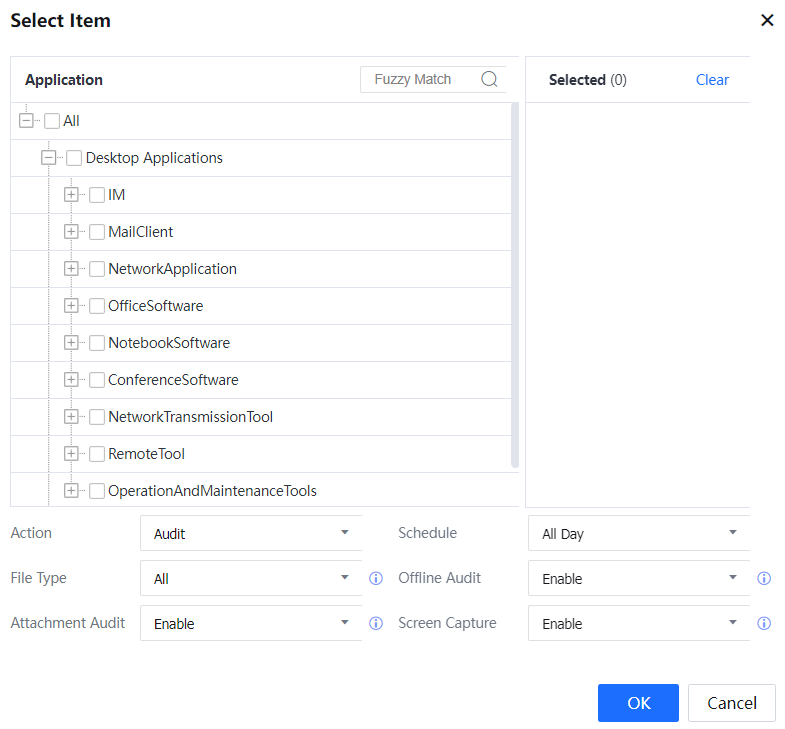 Specifically, the endpoint application audit involves the audit of predefined applications and custom applications. Predefined applications are classified into the following categories: IM, MailClient, NetworkApplication, OfficeSoftware, NotebookSoftware, ConferenceSoftware, NetworkTransmissionTool, RemoteTool, and OperationAndMaintenanceTools.