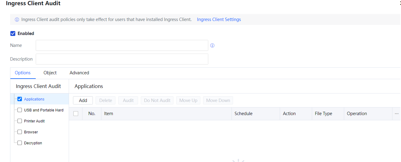 • Offline Audit: Select Enable or Disable as needed. If Enable is selected, the audit can be performed even if the Ingress Client is disconnected from the IAG device.