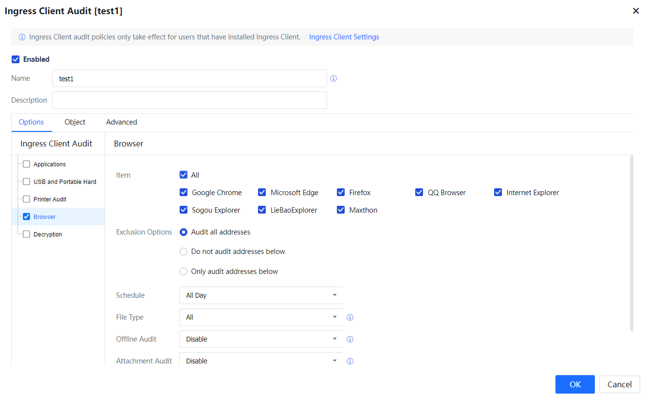 • Offline Audit: Select Enable or Disable as needed. If Enable is selected, the audit can be performed even if the Ingress Client is disconnected from the IAG device, that is, the intranet user is disconnected from the intranet.