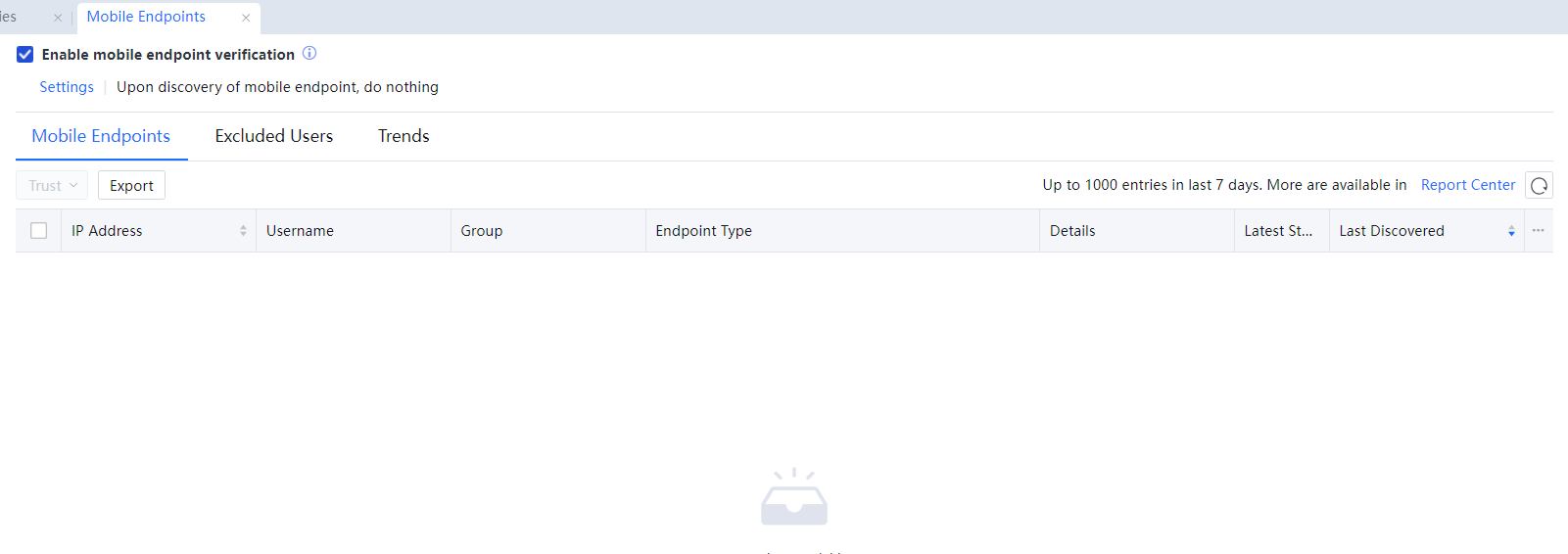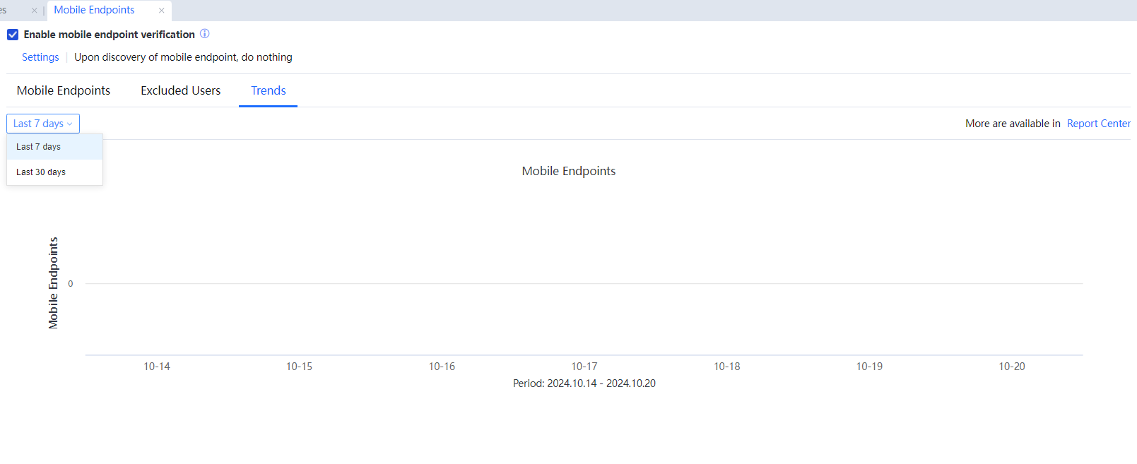 Trends: It calculates the number of mobile endpoints detected in the previous 7 or 30 days. You can click Report Center and query for more information on the mobile endpoint management page. See the following figure.