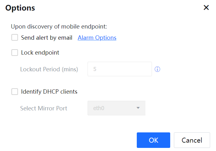 Select Identify DHCP clients to strengthen the capability to identify such endpoints after the mobile endpoint accesses the network. This function is new, in addition to the existing application capability of endpoint identification. To support the function of DHCP mobile endpoint identification, mirror the DHCP protocol to the device. This requires configuring the mirror port in the device gateway page to allow the device to capture data package at a specified networking interface.