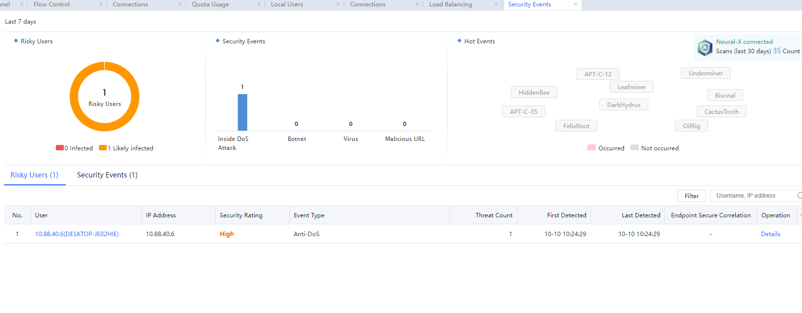 The Security Events display insecurity behaviors detected by the device and analyzes users and security events. If you can access the Sangfor Neural-X, you can also see the hot events. The interface is as follows: