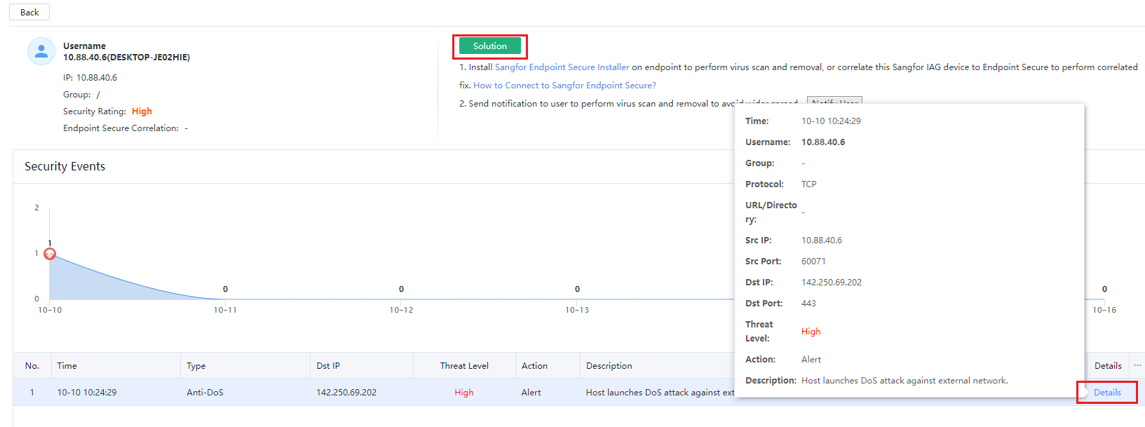 Endpoint correlation is also available at Sangfor Endpoint Secure products. After the Endpoint Secure correlation, risky users can be blocked by correlation with Endpoint Secure deepened analysis.