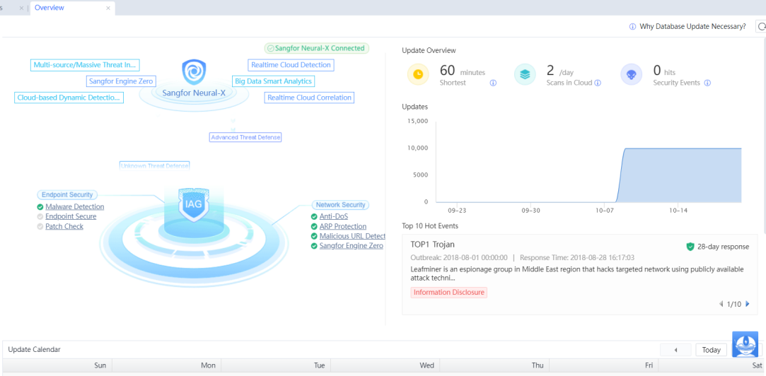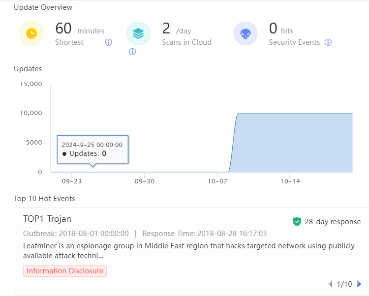 Display the security capability update in the last month. When the user puts the mouse on the update entry, it will display the specific update content and update amount, including URL rule base, malicious URL rule base, application identification rule base, Malware rule base, and the hotspot time update. It will display the updates and the quantity of the day.