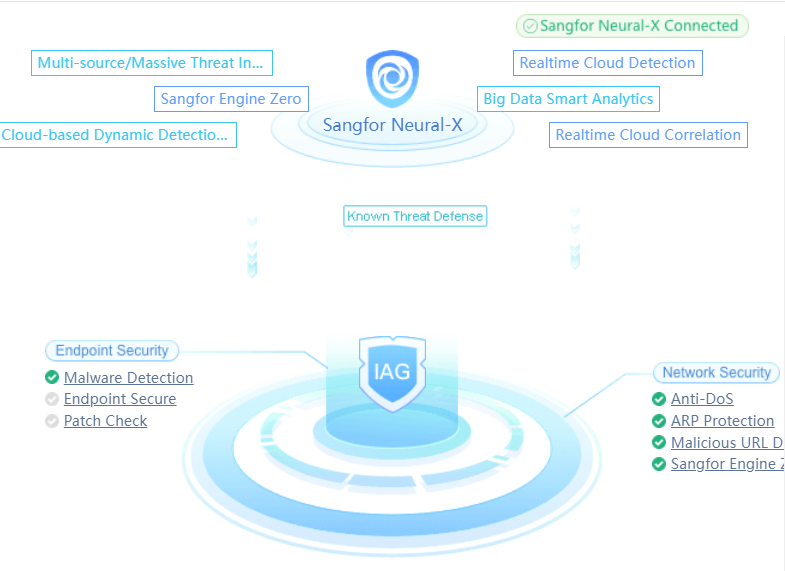 The device will be linked to Neural-X to build a three-dimensional threat-protection system. After accessing the Sangfor Neural-X, you can get multi-source/massive threat intelligence, Sangfor Engine Zero, Signature Database Pluses Experience, real-time cloud detection, big data smart analysis and detection, and real-time cloud correlation. Combined with devices, it provides you with three-dimensional security services from endpoint, content, and network security.
