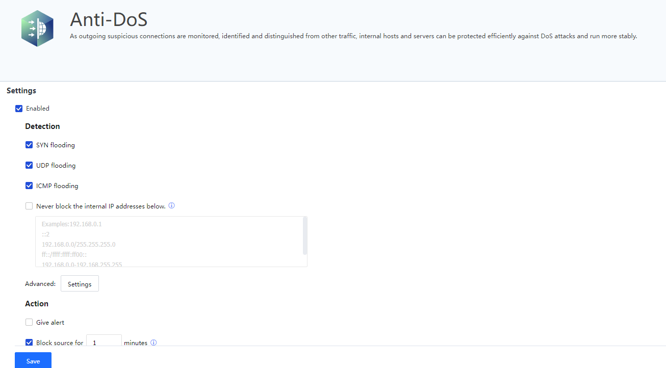 Enabled: the switch to enable Anti-DoS. There are three detection methods: SYN flooding, UDP flooding, and ICMP flooding.