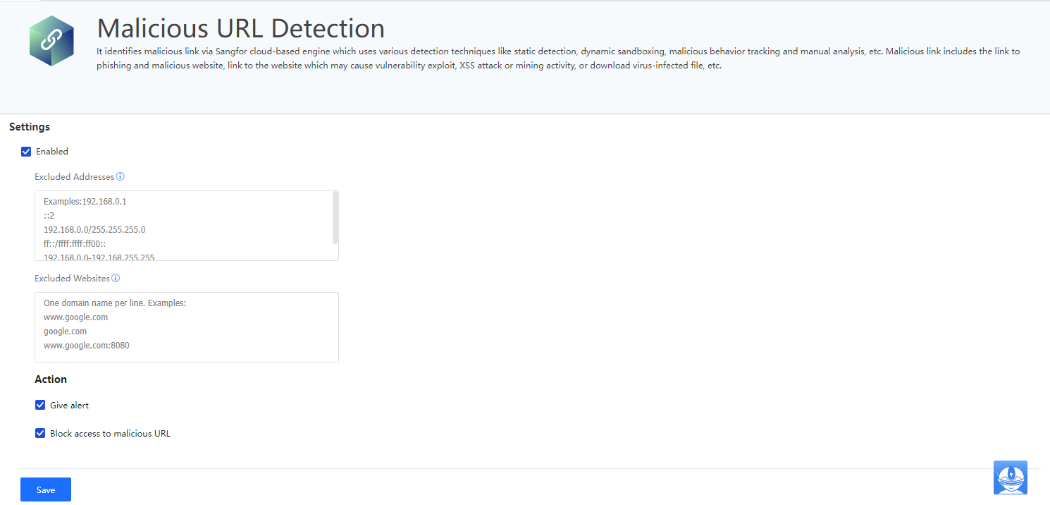Action: Select the Give alert (combination with the System > General > Alert Option) and Block access to malicious URL.
