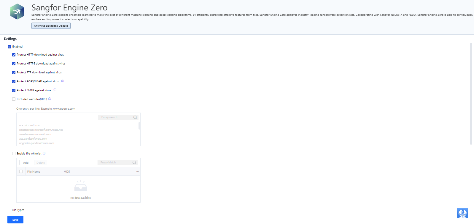 File Types: Specify the types of files to be scanned by Sangfor Zero Engine.