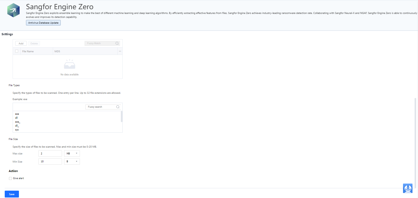 File Size: Specify the size of files to be scanned by Sangfor Zero Engine.[ZY174]