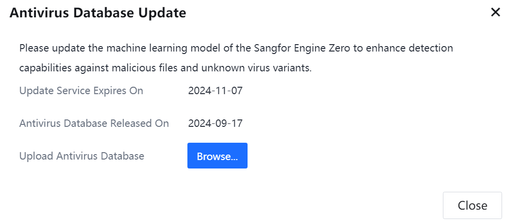 Upload Antivirus Database: Manually import the downloaded Antivirus Database file into the device and complete the Antivirus Database update. Click Browse to select the Sangfor Engine Zero model file to be imported and complete the Antivirus Database update.