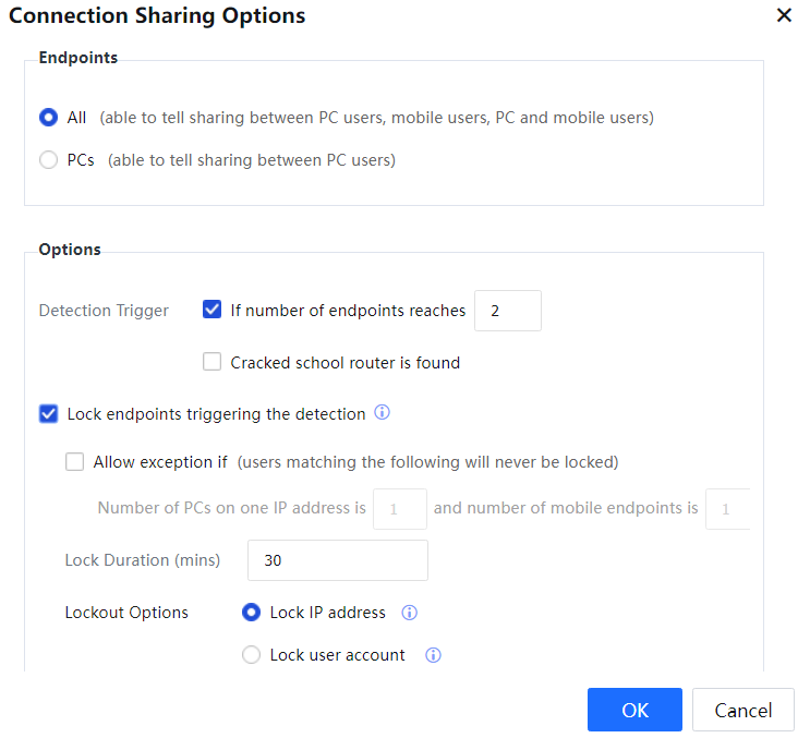 Step 2.On the connection sharing options page, click setting, and select the statistics method to count all endpoints. Set the number of endpoints reached two or more, and lock the user for 30 minutes.