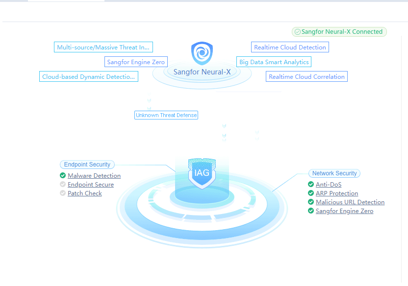 The device will be linked to Neural-X to build a three-dimensional threat-protection system. After accessing the Sangfor Neural-X, you can get multi-source/massive threat intelligence, Sangfor Engine Zero, Signature Database Pluses Experience, real-time cloud detection, big data smart analysis and detection, and real-time cloud correlation. Combined with devices, it provides three-dimensional security services for you from endpoint security, content security, and network security.