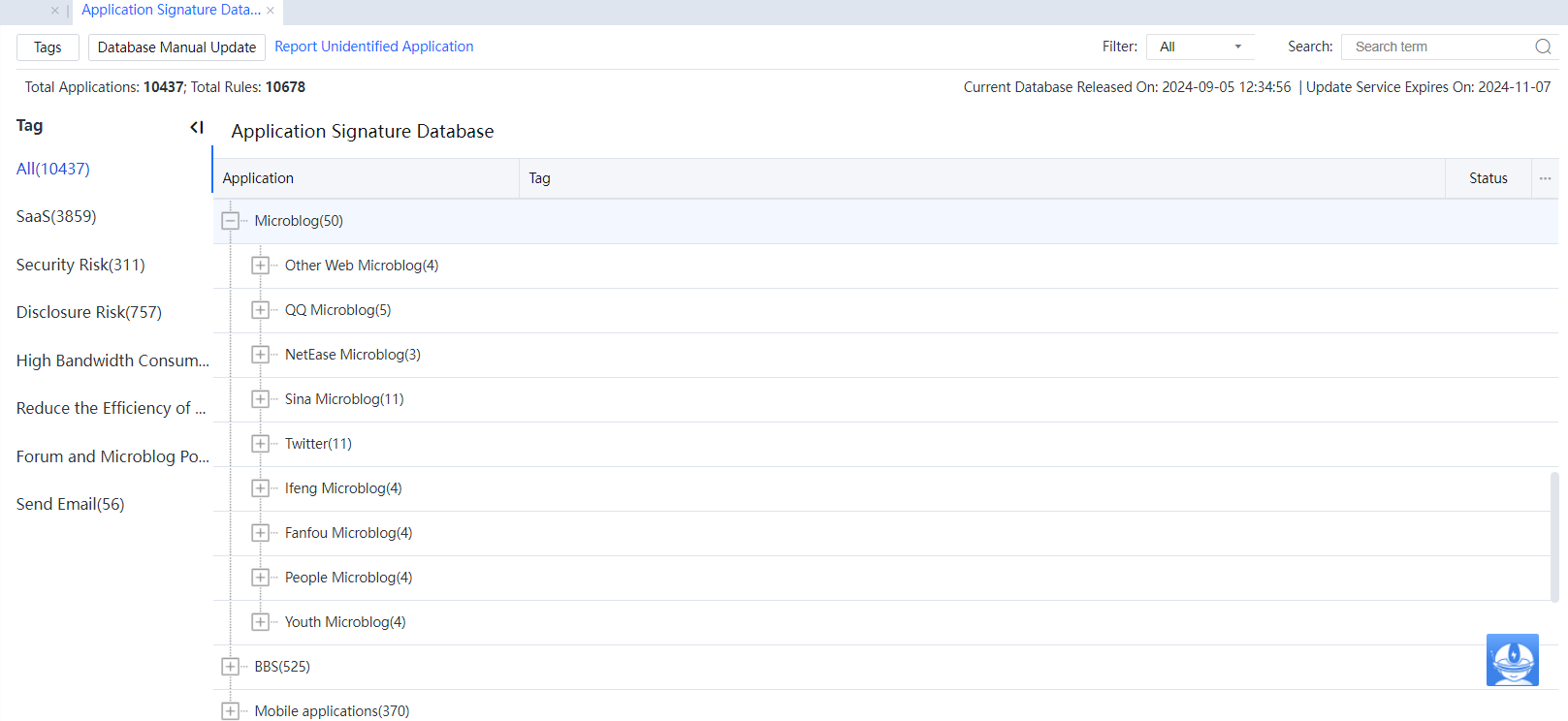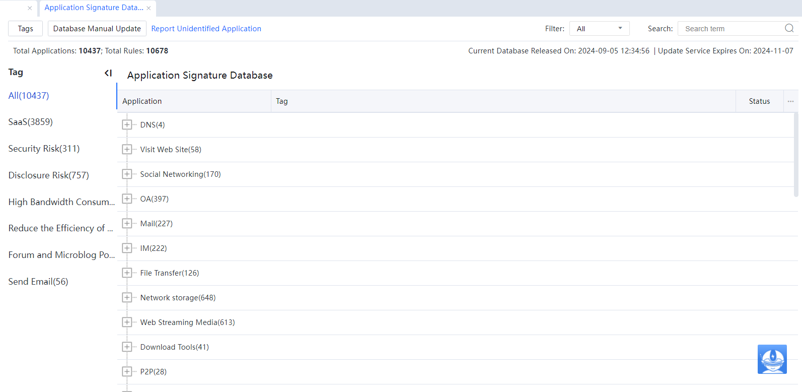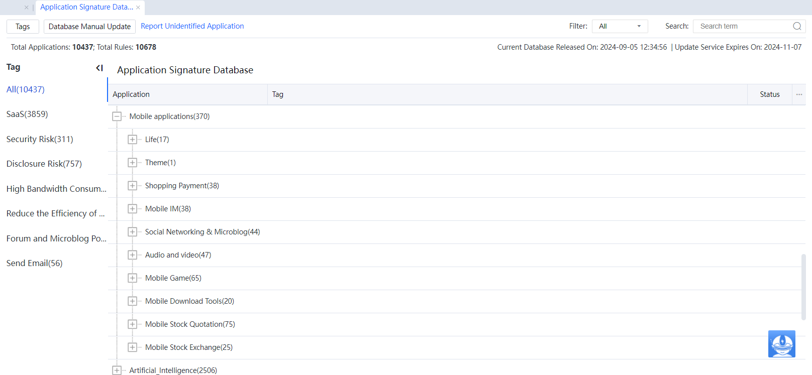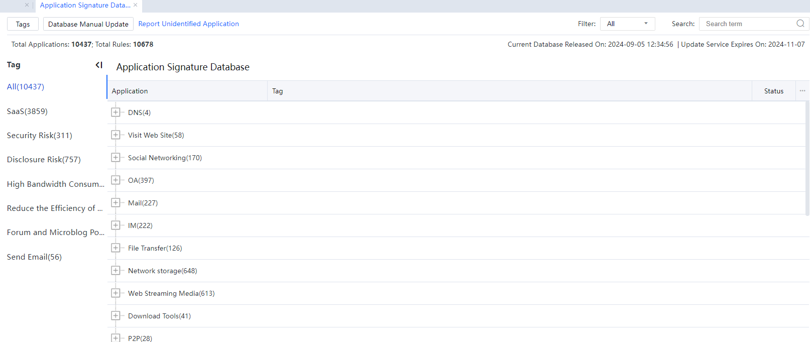 Current Database Released indicates the date of the embedded application identification library. Update Service Expires On indicates the upgrade validity period of the embedded application identification library.