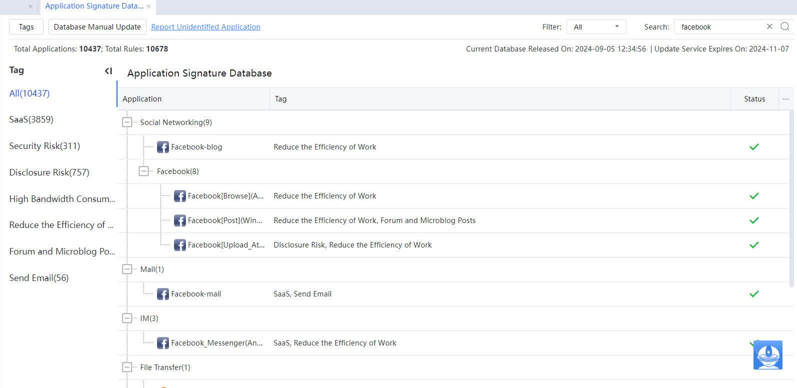 Navigate to Objects > Application Signature Database. The Application Signature Database pane is on the right. Next, select an application. For example, to disable the application rule of transferring files through Facebook, filter out the applications for transferring files through Facebook, as shown in the following figure.
