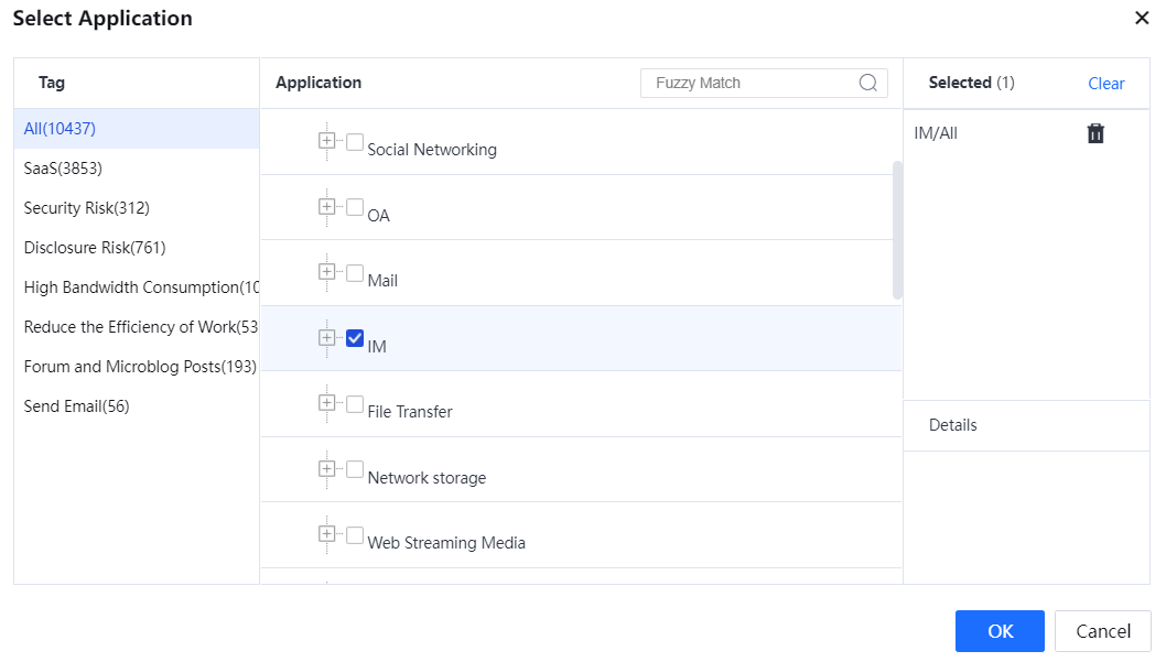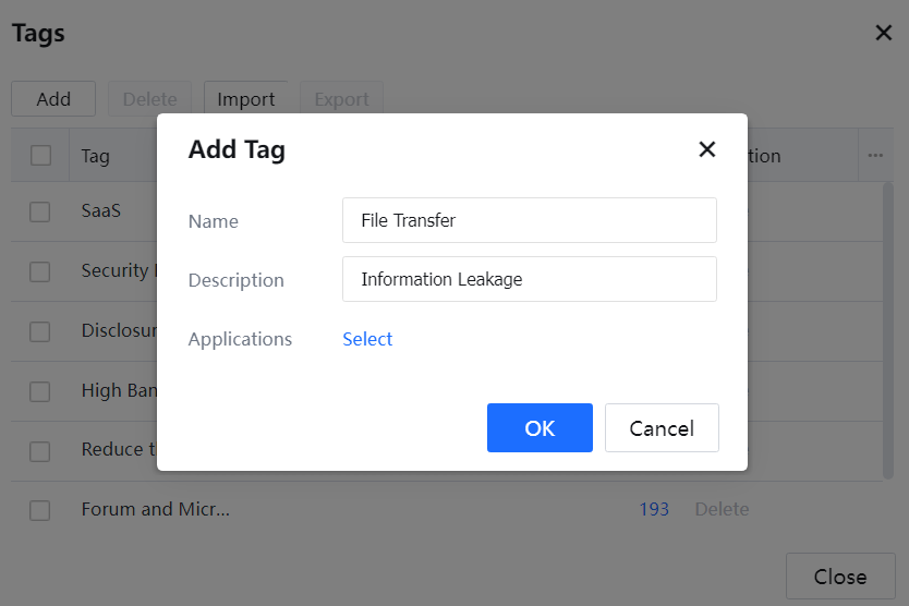 Click All, and all application types will be displayed on the Application Signature pane on the right. The device has six embedded labels: Security risks, Send Email, High Bandwidth Consumption, Reduce the Efficiency of Work, Forum and Microblog Posts, and Disclosure Risk. These embedded labels will be updated accordingly as the application identification library is updated. Applications with embedded labels cannot be deleted or added. To define labels, click Tags. All labels can be referenced on the page displayed after choosing Online Activities > Access Control.[A216][LCH217]