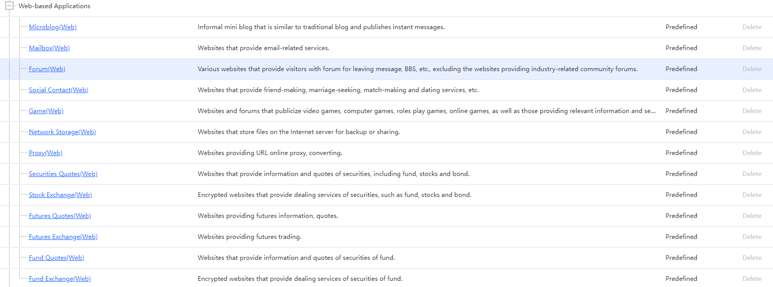 3. Some URL groups are not included in the application type Visit web site. Instead, they belong to the corresponding application type as web applications. For example, microblog URLs are included in the application type Microblog. Suppose control of microblog applications is enabled in Internet access policies. In that case, the device can control the behaviors of accessing microblog applications by using a web browser and the behaviors of accessing microblog clients.